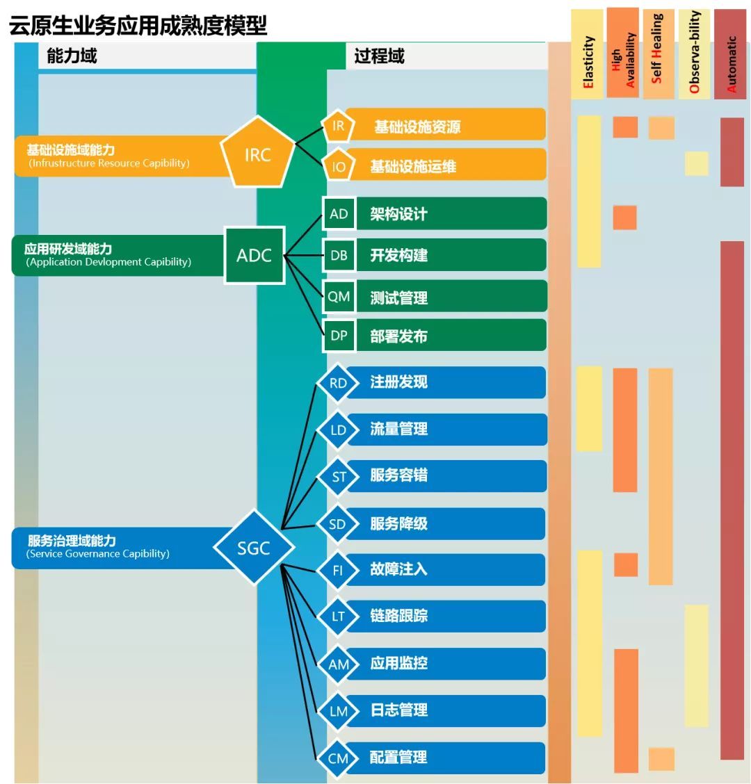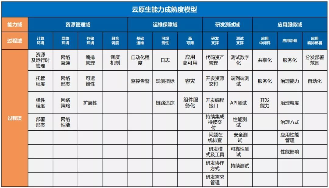 该项评估面向基于云原生技术建设的平台架构,用于帮助用户快速对照、定位技术架构能力水平,并根据自身业务需求结合模型高阶能力定制技术架构演进方向。评估涵盖资源管理、运维保障、研发测试、应用服务4个能力域,12个过程域,46个能力子项,476个细分能力要求,从弹性、高可用、自愈性、可观测性以及自动化五个维度反应技术架构的云原生特性。
