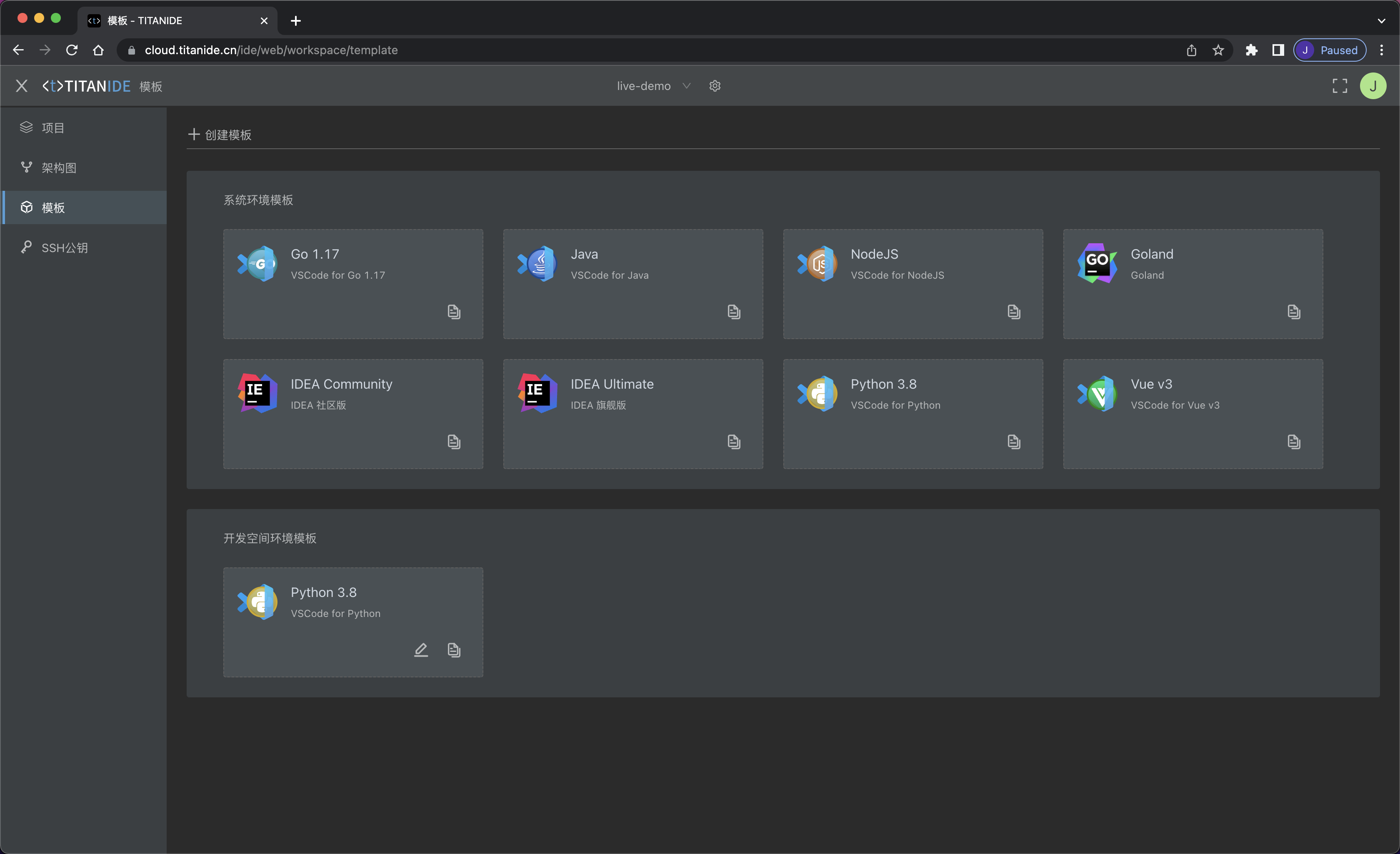 TITANIDE(在线IDE) 是采用 B/S 架构设计的云原生集成开发环境,内置了业界主流的IDE,让您能够更快速的启动一个您所熟悉的 IDE,不管您以前是使用 VS Code、WebStorm、Intellij IDEA、Goland、Pycharm,总有一款适合您。您无需搭建开发环境,只需要打开浏览器就能编写并运行、调试您的项目代码,从而聚焦您业务。
