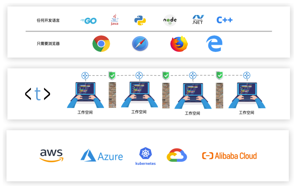 任何语言,任何时间,任何地方,只需要打开浏览器即可进行开发!