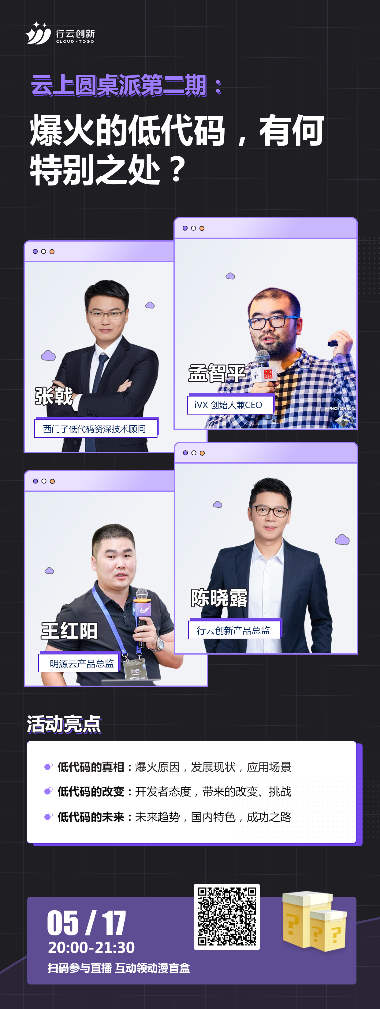 5月17日20:00《云上圆桌派第二期:爆火的低代码,有何特别之处》直播来啦!活动邀请西门子工业软件西门子低代码资深技术顾问张戟,iVX 创始人兼CEO孟智平,明源云产品总监王红阳,yabo.com创新产品总监陈晓露四位大咖和yabo.com创新CEO马洪喜一起对低代码爆火背后的原因、开发者对低代码的态度、低代码带来的变化和应用场景等多个话题展开讨论。